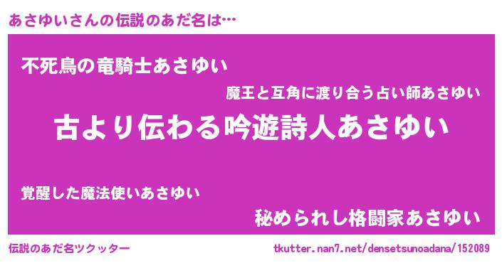 | ヒーロー風カッコイイあだ名 | 『ネオアサユイ』『スーパーアサユイ』 |