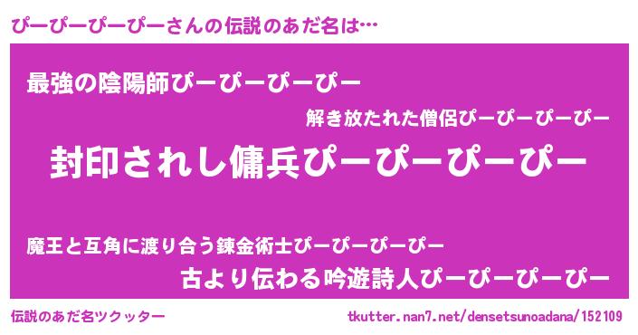 | 男性向けラノベタイトル風あだ名 | 『うちのぴーぴーぴーぴーが世界を掌握している!』 |