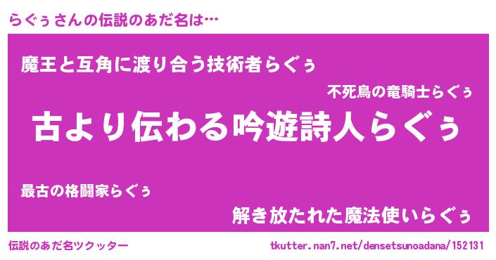 | 胡散臭い通販商品みたいなあだ名 | 『テレビで話題の高麗人参…その名も「らぐぅ」』 |