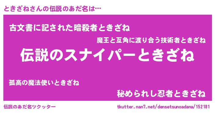 | 男性向けラノベタイトル風あだ名 | 『ときざねの憂鬱』『魔弾の王とときざね』 |
