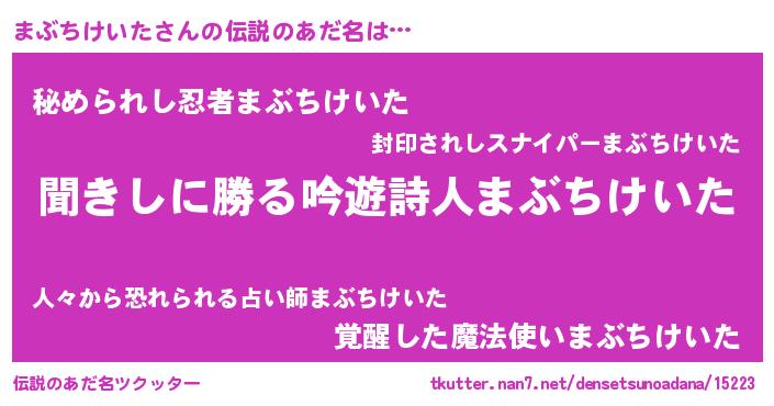 | 女子向けラノベタイトル風あだ名 | 『異世界で失敗しない100のまぶちけいた』 |