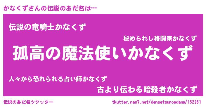 | ヒーロー風カッコイイあだ名 | 『暗黒騎士カナ』『超時空戦士カナクズ』 |