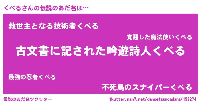 | 意味不明あだ名 | 『永久保存くべる』『自称くべる』 |