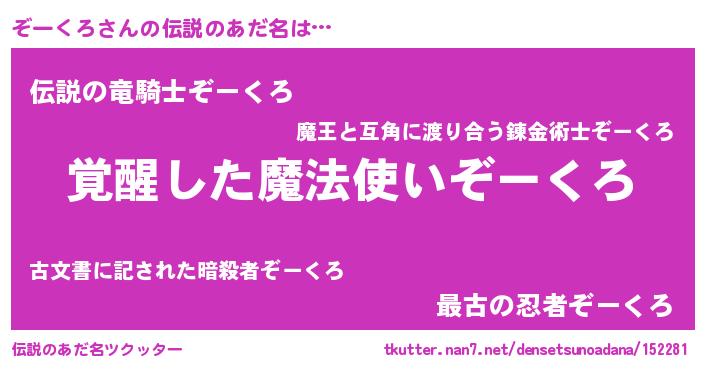 | 男性向けラノベタイトル風あだ名 | 『ぞーくろに滅ぼされるだけの簡単なお仕事です』 |