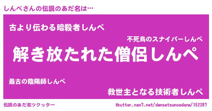 | 意味不明あだ名 | 『とにかく怪しいしんぺ』『自称しんぺ』 |