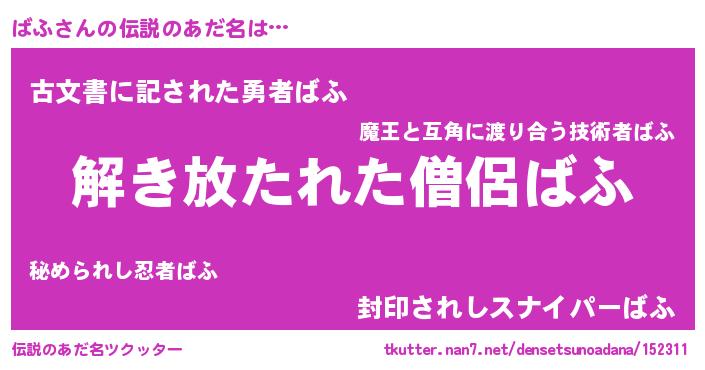 | 意味不明あだ名 | 『住所不定無職ばふ(43歳)』『ニラ科ばふ属』 |