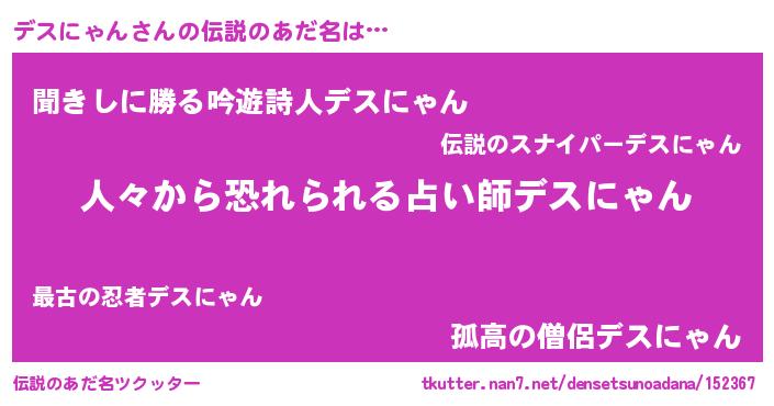 | 男性向けラノベタイトル風あだ名 | 『おまえをオタクにしてやるから、俺をデスにゃんにしてくれ! 』 |