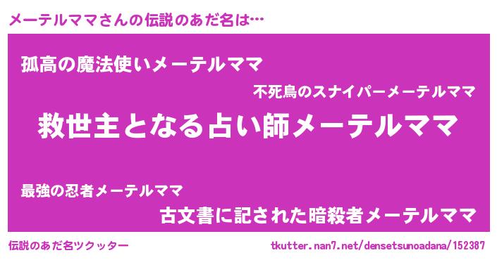 | 女子向けラノベタイトル風あだ名 | 『悪役メーテルママに転生したようですが、知った事ではありません』 |