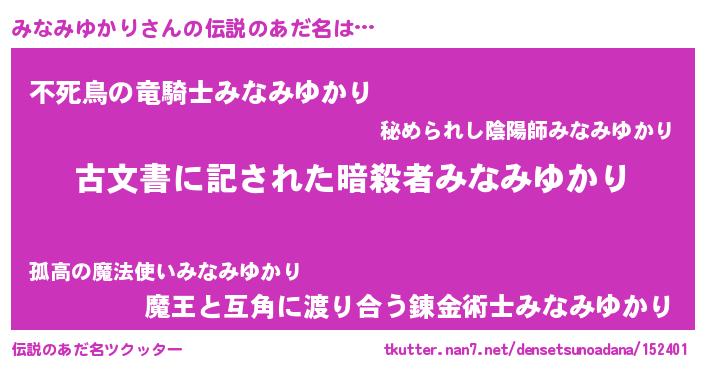 | 男性向けラノベタイトル風あだ名 | 『みなみゆかり~年齢イコール彼女いない歴の魔法使い~』 |