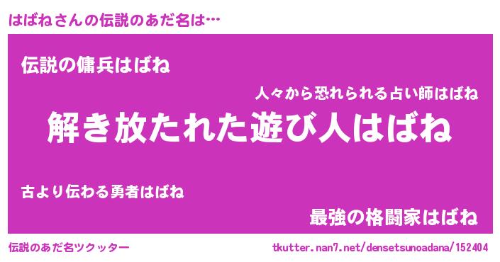 | 女子向けラノベタイトル風あだ名 | 『はばねの卵を拾いまして』 |