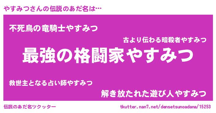 | ファンタジー風あだ名 | 『ゼヤストゥ』『エターナルヤスミツー』 |