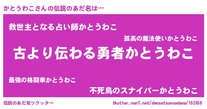 | 男性向けラノベタイトル風あだ名 | 『この素晴らしい世界にかとうわこを!』 |