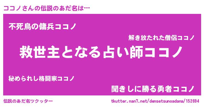 | ヒーロー風カッコイイあだ名 | 『究極戦士ココノ』『愛の使者ココノ』 |