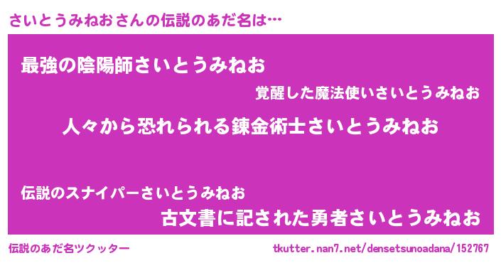 | 男性向けラノベタイトル風あだ名 | 『おまえをオタクにしてやるから、俺をさいとうみねおにしてくれ! 』 |