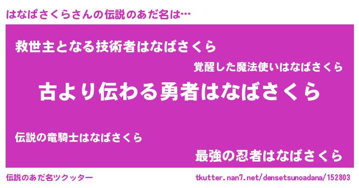 | 男性向けラノベタイトル風あだ名 | 『はなばさくらという概念が存在しない退屈な世界 』 |