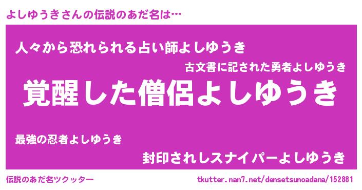 | ヒーロー風カッコイイあだ名 | 『天弓騎士ヨシ』『愛の使者よしゆうき』 |