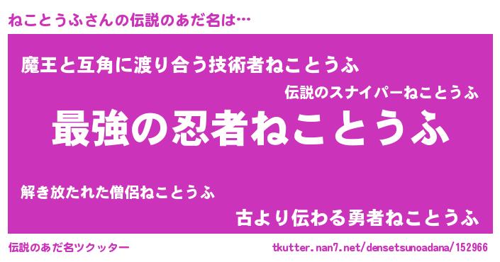 | 男性向けラノベタイトル風あだ名 | 『ねことうふ~年齢イコール彼女いない歴の魔法使い~』 |