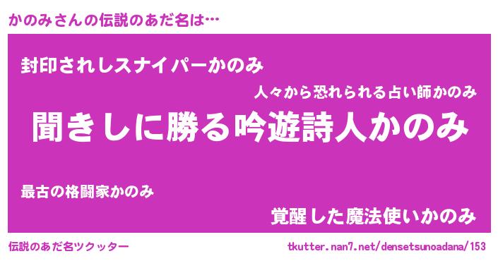 | 男性向けラノベタイトル風あだ名 | 『かのみという概念が存在しない退屈な世界 』 |