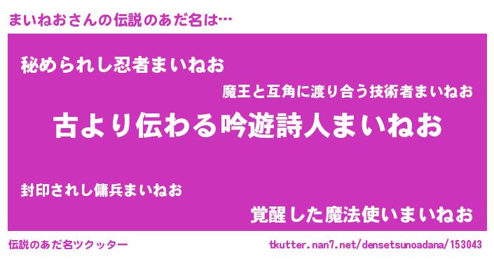 | 意味不明あだ名 | 『永久保存まいねお』『自称まいねお』 |