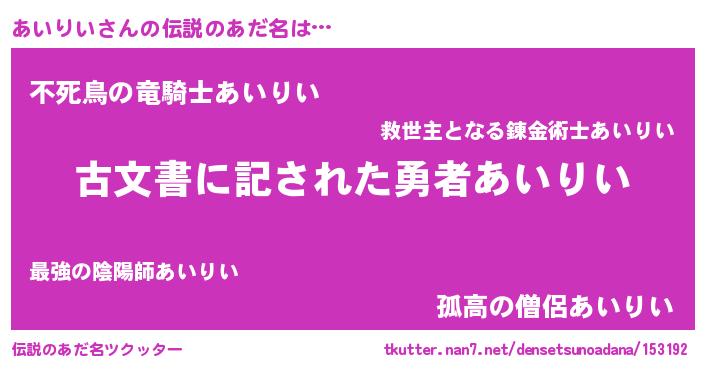 | ヒーロー風カッコイイあだ名 | 『ネオアイリイ』『スーパーアイリイ』 |