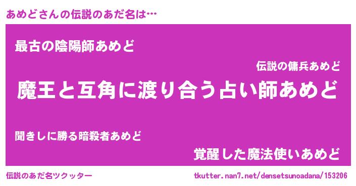| 男性向けラノベタイトル風あだ名 | 『おまえをオタクにしてやるから、俺をあめどにしてくれ! 』 |
