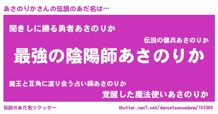 | 男性向けラノベタイトル風あだ名 | 『この素晴らしい世界にあさのりかを!』 |