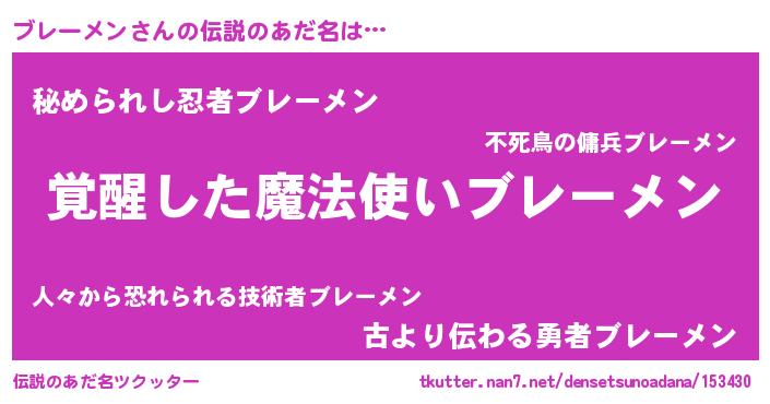 | 男性向けラノベタイトル風あだ名 | 『この素晴らしい世界にブレーメンを!』 |