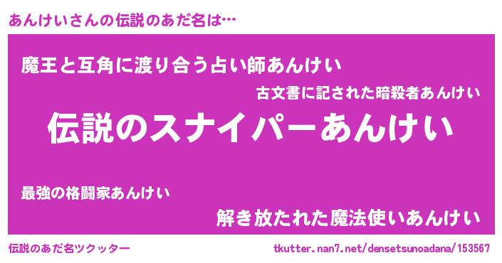 | 男性向けラノベタイトル風あだ名 | 『あんけいの憂鬱』 |