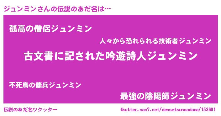 | 男性向けラノベタイトル風あだ名 | 『うちのジュンミンが世界を掌握している!』 |