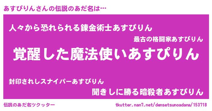 | 男性向けラノベタイトル風あだ名 | 『あすぴりんの嫁は女の子じゃないと思った?』 |