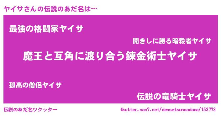 | ヒーロー風カッコイイあだ名 | 『最強戦士ヤイサ』『慈愛の使者ヤイサ』 |