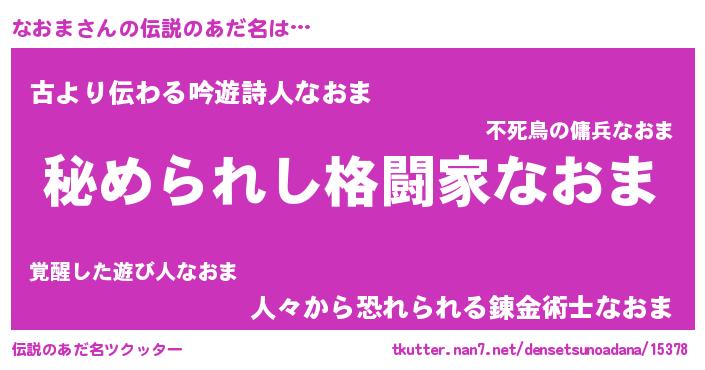 | 男性向けラノベタイトル風あだ名 | 『ナオマスレイヤー』『魔弾の王となおま』 |