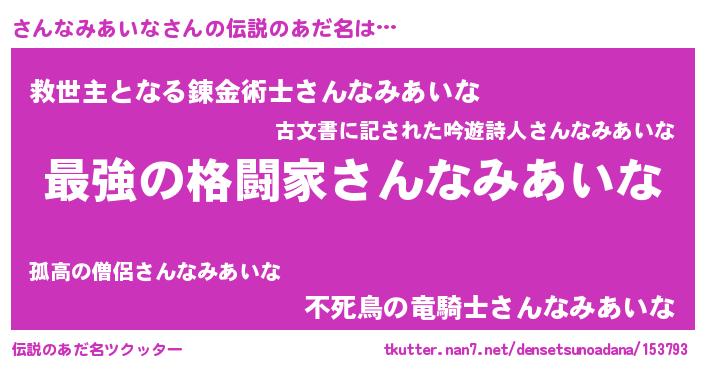 | 男性向けラノベタイトル風あだ名 | 『さんなみあいなに滅ぼされるだけの簡単なお仕事です』 |