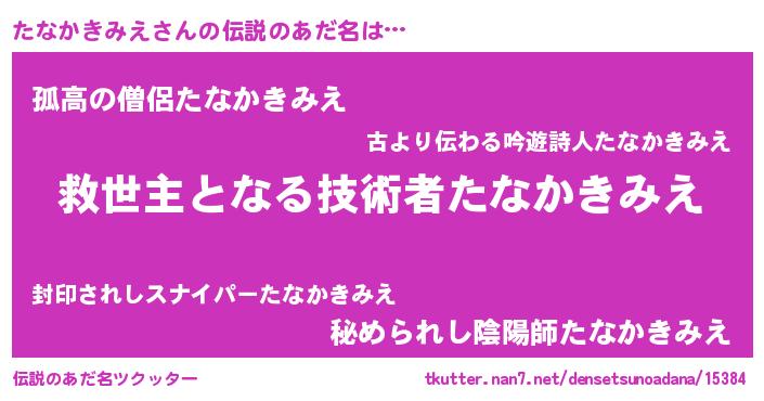 | 女子向けラノベタイトル風あだ名 | 『たなかきみえの玉の輿計画!』 |