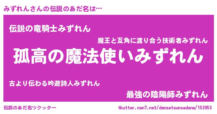 | 男性向けラノベタイトル風あだ名 | 『ミズレンスレイヤー』 |