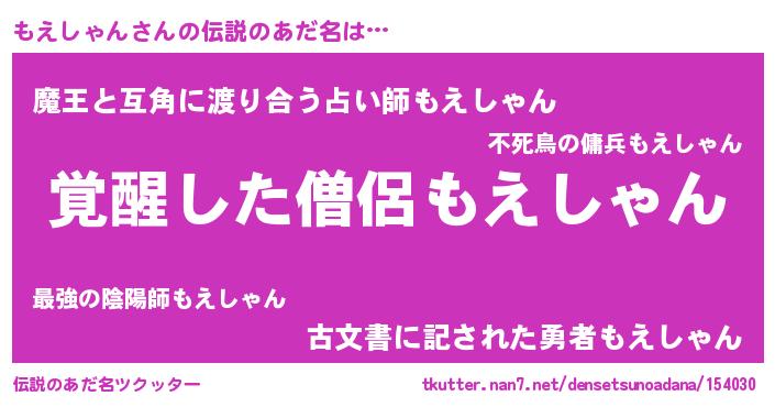 | 男性向けラノベタイトル風あだ名 | 『もえしゃんの嫁は女の子じゃないと思った?』 |