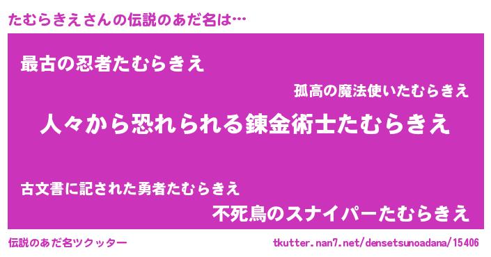 | 男性向けラノベタイトル風あだ名 | 『おまえをオタクにしてやるから、俺をたむらきえにしてくれ! 』 |
