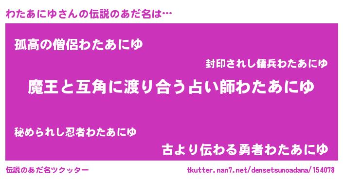 | 男性向けラノベタイトル風あだ名 | 『おまえをオタクにしてやるから、俺をわたあにゆにしてくれ! 』 |
