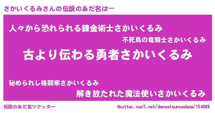 | ヒーロー風カッコイイあだ名 | 『ネオサカイクルミ』『魔戒騎士サカ』 |