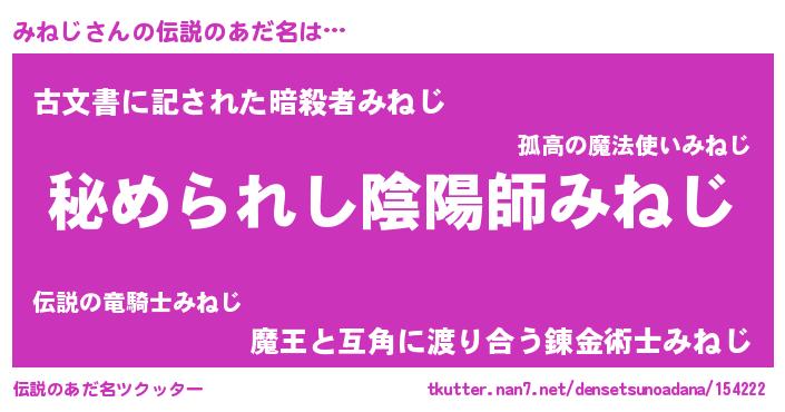 | 意味不明あだ名 | 『住所不定無職みねじ(85歳)』『自称みねじ』 |