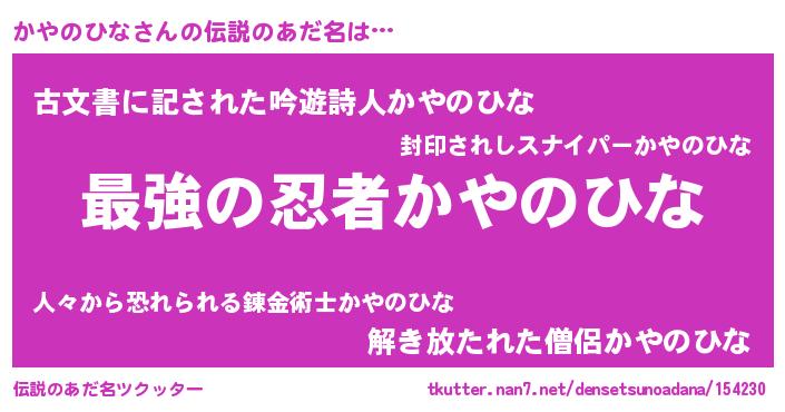 | ファンタジー風あだ名 | 『エターナルカヤノヒナー』『ゼカヤトゥ』 |