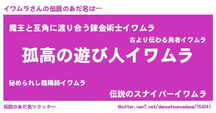 | ヒーロー風カッコイイあだ名 | 『仮面イワダー』『銀牙騎士イワ』 |
