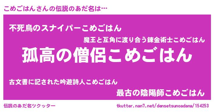 | 男性向けラノベタイトル風あだ名 | 『コメゴハンスレイヤー』 |