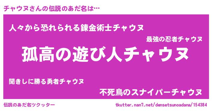 | 男性向けラノベタイトル風あだ名 | 『魔弾の王とチャウヌ』 |