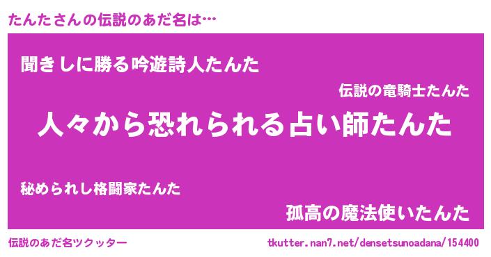| 男性向けラノベタイトル風あだ名 | 『魔弾の王とたんた』 |