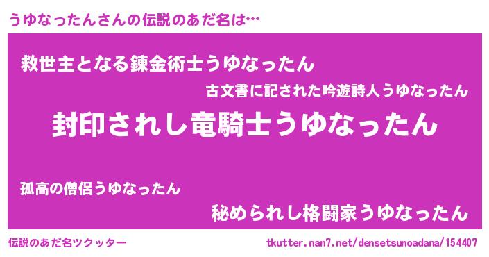 | 男性向けラノベタイトル風あだ名 | 『うゆなったん~年齢イコール彼女いない歴の魔法使い~』 |