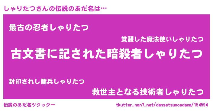 | 男性向けラノベタイトル風あだ名 | 『この素晴らしい世界にしゃりたつを!』 |