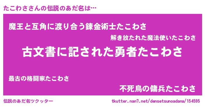 | ヒーロー風カッコイイあだ名 | 『ネオタコワサ』『慈愛の使者たこわさ』 |