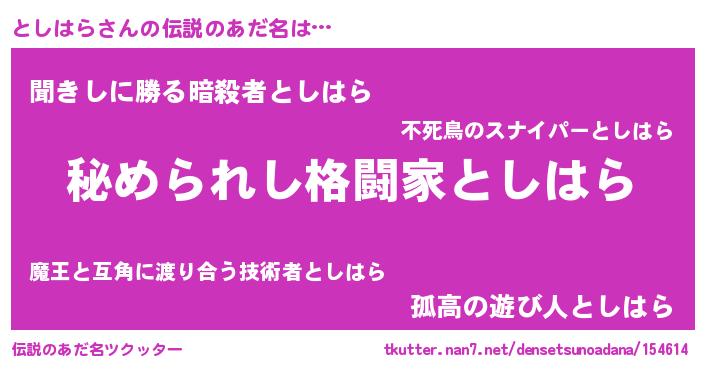 | ヒーロー風カッコイイあだ名 | 『超時空戦士トシハラ』『仮面トシダー』 |