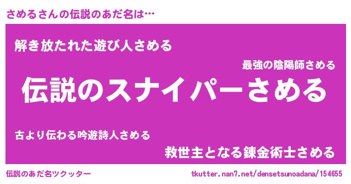| 男性向けラノベタイトル風あだ名 | 『魔弾の王とさめる』『さめるの憂鬱』 |